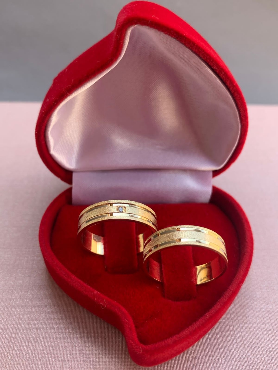 Par de aliança de ouro 18k reta por dentro e por fora com dois frisos e diamantado 5mm